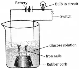 In a glass beaker, take a dilute solution of glucose (C6H12O6). Fix two small nails of iron in a rubber cork and place the cork in the beaker as shown in the figure. Connect the nails to the terminals of a 6 volt battery through a bulb. Switch on the current. The bulb will not glow. This shows that the electric current has not passed through the glucose solution. As the current is carried by the movement of ions, it shows that the solution of
