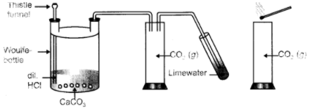Material Required: CaCO3(marble chips), Woulff-bottle, thistle funnel, dil. HCl, gas jar, matchbox, delivery tube bent at two right angles, lime water.