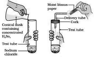 Take about 1g solid NaCl in a clean and dry test tube and add some concentrated sulphuric acid to it. Fit a rubber cork with a small delivery tube in the mouth of the test tube. Concentrated sulphuric acid reacts with sodium chloride to form hydrogen chloride gas. The hydrogen chloride gas starts coming out of the open end of the glass tube.