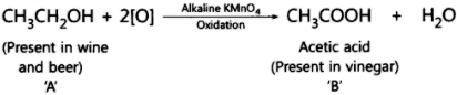 'A' is ethanol (C2H5OH) which is essential constituent of wine and beer and 'B' is acetic acid (CH3COOH) which is present in vinegar.