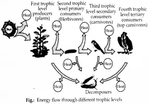 Energy flow in an ecosystem is always unidirectional or one way, i.e., solar radiation → producers → herbivores → carnivores. It cannot pass in the reverse direction. There is a decrease in the content and flow of energy with the rise in trophic level. Only 10% of energy is transferred from one trophic level to the next.