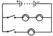 Draw a circuit diagram to show how 3 bulbs can be lit from a battery so that 2 bulbs are controlled by the same switch while the third bulb has its own switch.