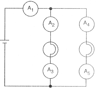 If the lamps are both the same in the figure given below and if A1, reads 0.50 A, what do A2, A3, A4 and A5 read?
