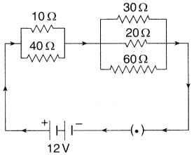 In the circuit diagram given below five resistances of 10 Ω, 40 Ω, 30 Ω, 20 Ω and 60 Ω are connected as shown to a 12 V battery.