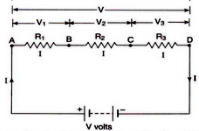 (a) Fig shows three resistances R1, R2 and R3 connected in series with a battery of V volts.