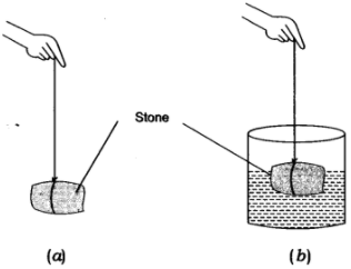 Take a piece of stone and tie it to one end of a rubber string or a spring balance. Suspend the stone by holding the balance or the string as shown in the figure (a).