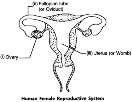 Draw a diagram of a human female reproductive system and label the part (i) that produces egg (ii) where fusion of egg and sperm take place (iii) where zygote is implanted What happens to human egg when it is not fertilised?