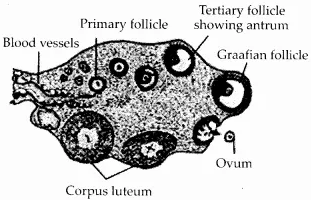Draw a neat diagram of the female reproductive system and label the parts associated with the following: (a) production of gametes, (b) site of fertilization (c) site of implantation and (d) birth canal.
