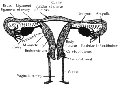 Draw a neat diagram of the female reproductive system and label the parts associated with the following: (a) production of gametes, (b) site of fertilization (c) site of implantation and (d) birth canal.