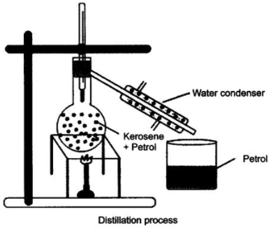 A mixture of kerosene and petrol which are miscible with each other can be separated by distillation.