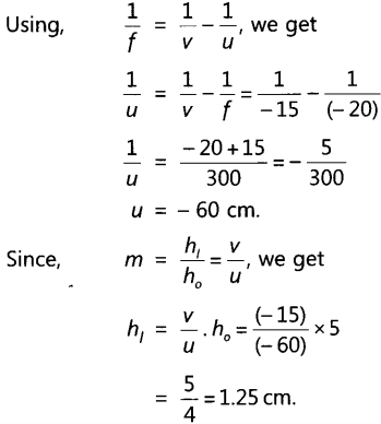A concave lens has focal length of 20 cm. At what distance from the lens a 5 cm tall object be placed so that it forms an image at 15 cm from the lens? Also calculate the size of the image formed.