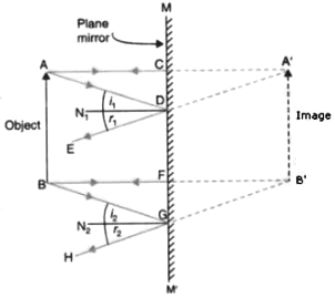 (a) An extended object in the form of an arrow pointing upward has been placed in front of a plane mirror. Draw a labelled ray diagram to show the formation of its image.