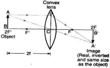 An object is placed at a distance equal to 2f in front of a convex lens. Draw a labelled ray diagram to show the formation of image. State two characteristics of the image formed.