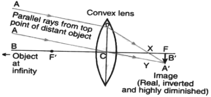 Describe with the help of a ray diagram the nature, size and position of the image formed when an object is placed at infinity (considerable distance) in front of a convex lens. State three characteristics of the image so formed.