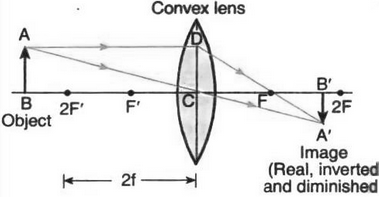 When an object is placed beyond 2f in front of a convex lens, then the image formed is between f and 2f on the other side of the lens, it is real, inverted and smaller than the object.