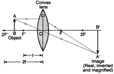 Draw a ray diagram to show the formation of a real magnified image by a convex lens. (In your sketch the position of object and image with respect to the principal focus of lens should be shown clearly).