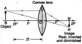 (b) Draw a ray diagram to show the formation of a real diminished image of an object by a convex lens. In your diagram, the position of object and image with respect to the principal focus should be shown clearly.