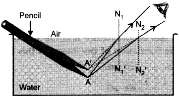 Explain with the help of a diagram, why a pencil partly immersed in water appears to be bent at the water surface.