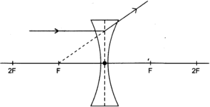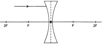 Redraw the diagram given below in your answer book and show the direction of the light ray after refraction from the lens.