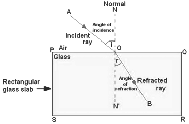 What is meant by the ‘angle of incidence’ and the ‘angle of refraction’ for a ray of light? Draw a labelled ray diagram to show the angle of incidence and the angle of refraction for a refracted ray of light.