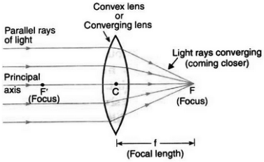 (a) When a beam of light rays parallel to one another and also to the principal axis of the convex lens fall on the lens, the incident rays pass through the lens and get refracted according to the laws of refraction. All the rays, after passing through the lens, converge at the same point F (focus) on the other side of the lens.