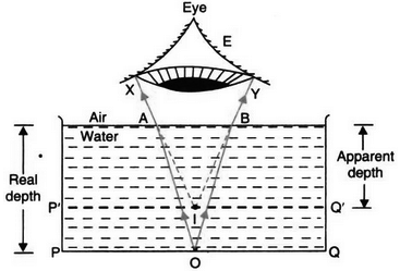 (a) With the help of a labelled diagram, explain why a tank full of water appears less deep than it actually is.