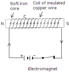 A coil C of insulated copper wire is wound around a soft iron core NS and the two ends of the copper coil are connected to a battery. Thus, an electromagnet using a soft iron core.