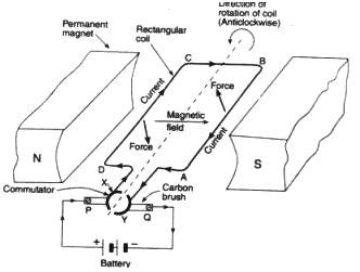 Suppose the coil ABCD is initially at a horizontal position. When the switch is in ON position the current enters the coil through the carbon brushes and the half ring ‘A’ of the commutator.