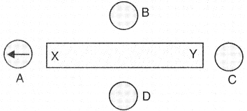 The diagram shows a bar magnet surrounded by four plotting compasses. Copy the diagram and mark in it the direction of the compass needle for each of the cases B, C and D.