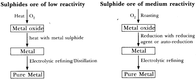 Sulphide ore like Zn, on roasting (in presence of O2) gives metal oxide which on reduction with metal sulphide (ZnS) or suitable reducing agent gives metal which is refined by electrolyte refining.