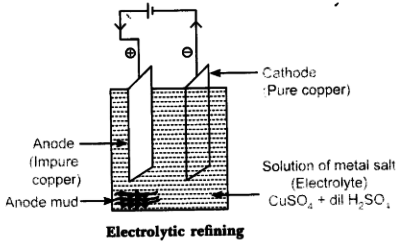 Impure metal is purified by electrolytic refining (i) Given below are steps for extraction of copper from its ore. Write the reaction involved. (a) Roasting of copper (I) sulphide (b) Reduction of copper (I) oxide with copper (I) sulphide (c) Ele...
