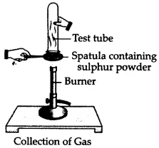 Pratyush took sulphur powder on a spatula and heated it. He collected the gas evolved by inverting a test tube over it as shown in the figure.