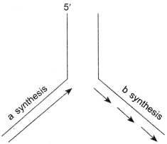 Name the types of synthesis ‘a’ and ‘b’ occurring in the replication fork of DNA as shown below:
