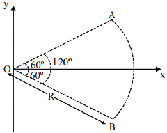 The figure show a rod AB, which is bent in a 120° circular arc of radius R. A charge (-Q) is uniformly distributed over rod AB. What is the electric field \(\vec{E}\) at the centre of curvature O?