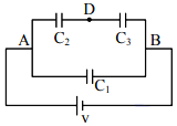 Three capacitors C1 = 2μF, C2 = 6μF and C3 = 12μF are connected as shown in figure. Find the ratio of the charges on capacitors C1, C2 and C3 respectively
