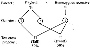 Example: When a tall plant (TT) is crossed with the dwarf plant (tt) in the F1, generation only tall plant (Tt) appears which is then crossed with homozygous recessive (tt) in a test cross.