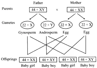 In humans, there are 23 pairs of chromosomes. 22 pairs of these chromosomes do not take part in sex determination called autosomes. The 23rd pair determines the sex of an individual called allosome or sex chromosome. If it is XX then female, if XY then male. The presence of Y1 makes a person male. Human females produce only 1 type of gamete 22 + X. In males, it could be 22 + X or 22+ Y.