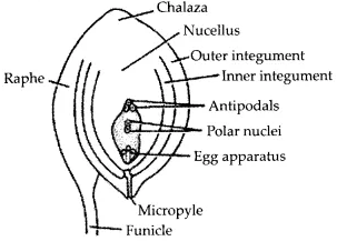 - In inverted ovules (most common type), the stalk or funiculus is attached to the main body of ovule for some distance to form a ridge like structure, called- raphe.