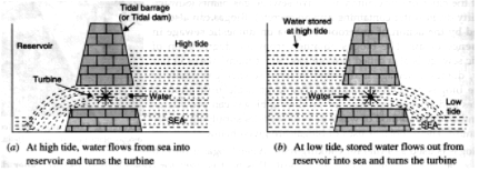 During high tide, when the level of water in the sea is high, sea-water flows into the reservoir of the barrage and turns the turbines. The turbines then turn the generator to produce the electricity. And during the low tide, when the level of sea-water is low, the sea-water stored in the barrage reservoir is allowed to flow out into the sea. This flowing water also turns the turbines and generates electricity.