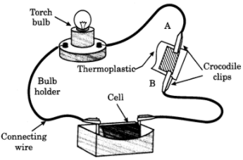 Arrange a circuit as shown in the given figure. Leave a gap between two ends of the wire. Place a thermoplastic in the gap. Observe the bulb.