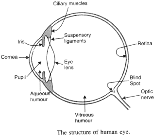 Draw a simple diagram of the human eye and label clearly the cornea, iris, pupil, ciliary muscles, eye-lens, retina, optic nerve and blind spot. (b) Describe the working of the human eye with the help of the above diagram.