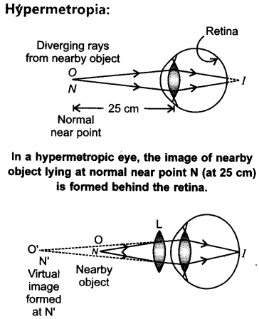 Correction of Hypermetropia: The convex lens forms a virtual image of the object (lying at normal near point N) at the near point 'N' of defective eye. It helps the eye to form the image on the retina.